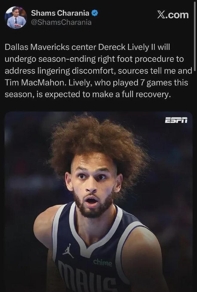 No!正式宣布赛季报销!独行侠的主力中锋